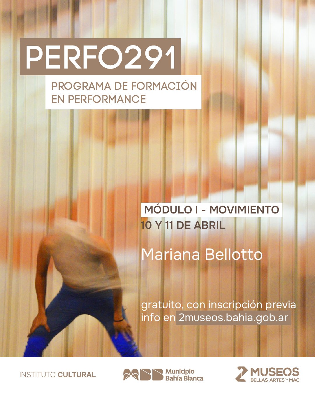 PROGRAMA DE FORMACIÓN EN PERFORMANCE PERFO291 es un programa de formación en performance concebido como laboratorio de investigación, experimentación y producción colectiva, con base en 2Museos, Bellas Artes y MAC, dependientes del Instituto Cultural de Bahía Blanca. El término performance connota simultáneamente un proceso, una práctica, una episteme, un modo de transmisión, una realización y un medio de intervenir en el mundo. Lejos de ser un objeto estable la performance es un espacio de cruces de conocimientos, saberes, afectos, identidad y memoria social desde los cuerpos y los sujetos. Desde esta perspectiva, y entendiendo a los museos como plataformas activas para la creación contemporánea, el cruce interdisciplinario y la producción colaborativa entre artistas, el programa propone habilitar búsquedas en las que el movimiento, lo visual, los objetos, la voz y diversos objetos y artefactos se combinen como lenguajes mestizos, acompañando tanto nuevos formatos de producción como el desarrollo y la